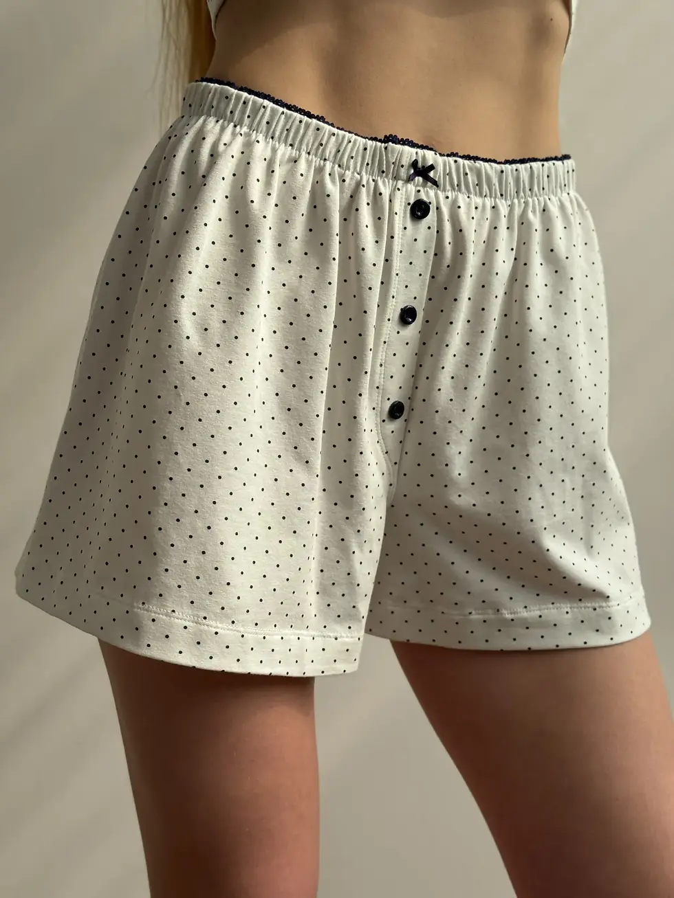 Трикотаж шорти с гульфом горох синій на білому